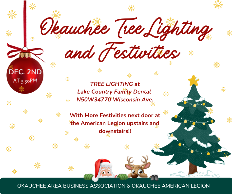 Get into the holiday spirit with the Okauchee Area Business Association and Okauchee American Legion as we celebrate the season with our annual Tree Lighting! Enjoy an evening filled with fun and festive activities for all ages both indoor and outdoor! This year we will have activities on both levels of the Legion and outside!